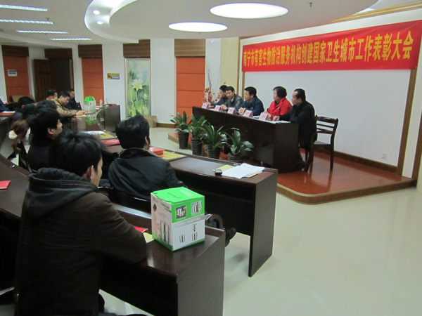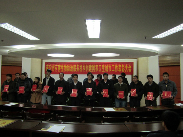 2012年3月8日,由南寧市愛衛(wèi)辦組織在市衛(wèi)生局隆重舉行了“南寧市有害生物防治服務機構創(chuàng)建國家衛(wèi)生城市工作表彰大會”,南寧市康凈衛(wèi)生消毒殺蟲有限責任公司在首府南寧市創(chuàng)建國家衛(wèi)生城市工作中,成績突出,被評為先進單位以及本公司馮東等6名員工被評為先進個人,圖為李作慶副主任主持會議及頒發(fā)證書現(xiàn)場。