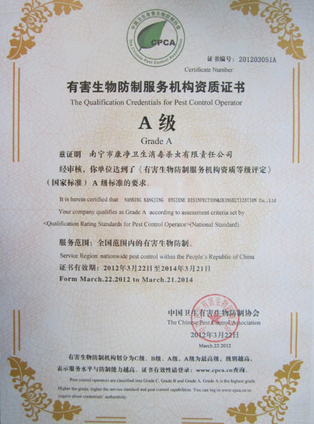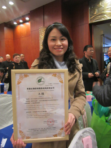 2012年3月21日-24日,中國衛(wèi)生有害生物防制協(xié)會2012年年會暨第四屆三次理事會在六朝古都南京市隆重召開,康凈公司被授予“中國有害生物防制服務(wù)機構(gòu)資質(zhì)A級證書”。年會是我國有害生物防制行業(yè)界最具規(guī)模與影響力的年度盛會,屆時,全國協(xié)會及會員單位、外國協(xié)會、省市地方協(xié)會(港臺協(xié)會)、愛衛(wèi)系統(tǒng)、疾控系統(tǒng)、科研院校、藥械生產(chǎn)與經(jīng)營企業(yè)、PCO企業(yè)等有關(guān)人士齊聚一堂,本次會議以“除四害與愛國衛(wèi)生運動——紀念愛國衛(wèi)生運動開展60周年”為主題,并對2011年通過A級資質(zhì)考評的全國10家PCO公司正式頒發(fā)資質(zhì)證書。圖為(中國衛(wèi)生有害生物防制協(xié)會)秘書長楊華林先生、(歐洲有害生物管理業(yè)協(xié)會)總干事Rob Fryatt 先生作報告,及頒發(fā)證書現(xiàn)場。